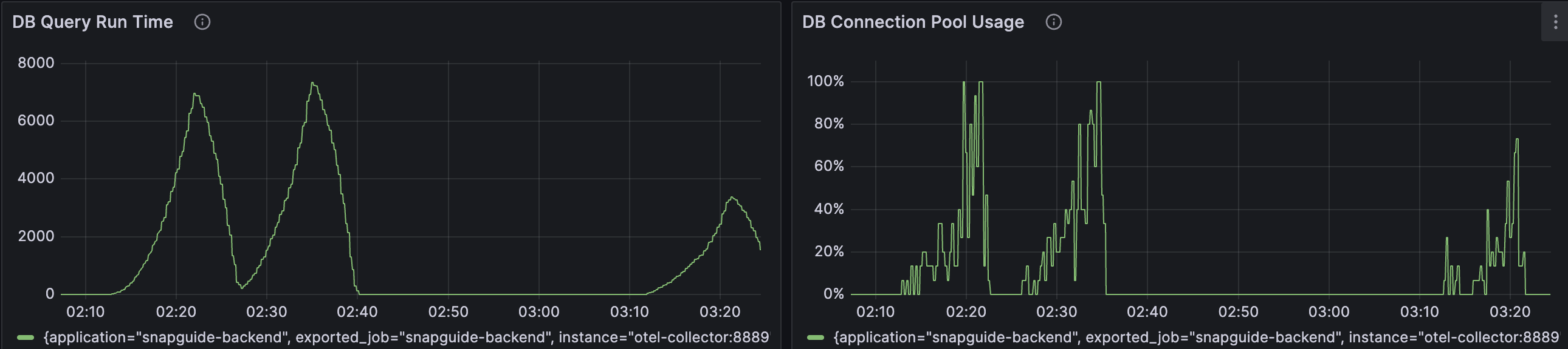 max VUser수가 300까지 올라가버린 이유도 있지만, 시스템 메트릭을 확인해보면 cpu 사용량이 95%, DB Connection Usage 또한 100%로 병목이 발생한 것을 확인할 수 있었습니다.